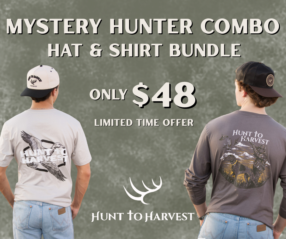 The Mystery Hunter Combo includes one premium Hunt to Harvest T-shirt and one hat, hand-picked from our best-selling designs. Same quality. Same grit. Just a better deal.